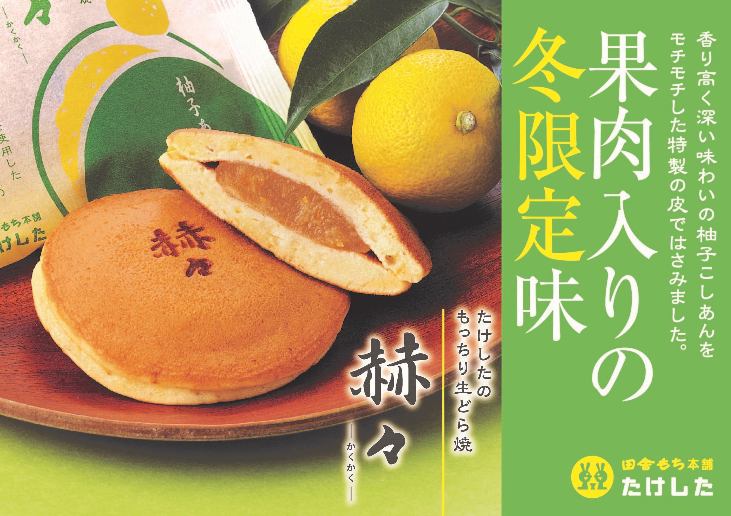 果肉と皮を使用した香り高く深い味わいの柚子こしあんをモチモチした特製の皮でをはさんだどら焼です。